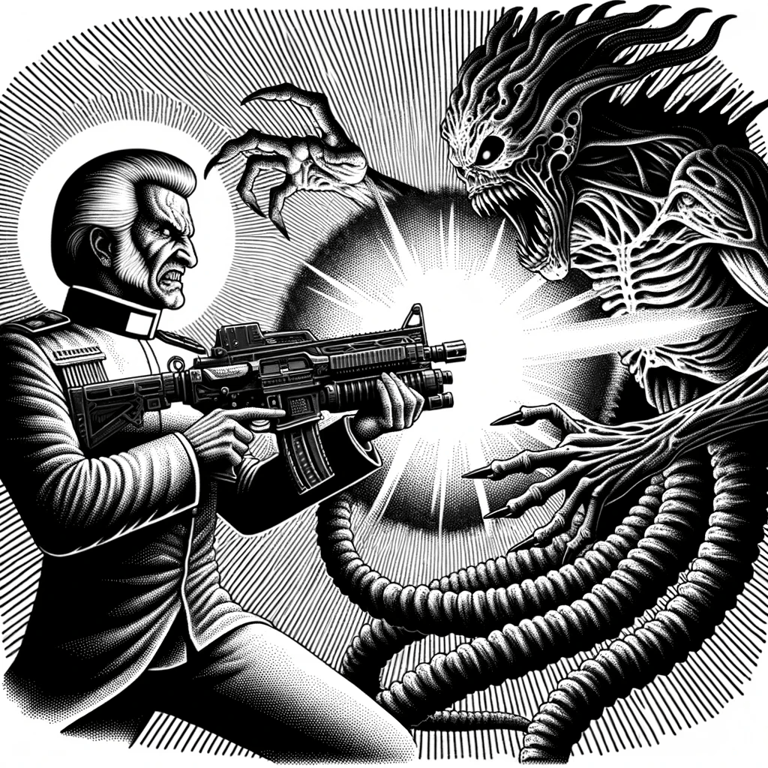 And so Urlan’s rifle became able to reconfigure itself, its jacket to project holos to camouflage as a normal piece of outfit – but it’s twitchy because it took a couple bullets too many. The demon became a shapeshifter and the ship a temple ship with a thousand doors opening on different places to find God. None of this was in the original script – Hell, there was no original script. Everything was emergent narrative from the art as it kept being cooked up by ChatGPT/Dall-E. The whole process became something chaotic but an order arose. It was about making a bunch of images in ChatGPT; stop as it began drifting. Then looking at them together, and taking a long walk to the beach or through the lava fields outside our house, talking and talking and talking and trying to solve a mystery, make sense, give sense, and then when that was done – oh, there were powerful epiphanies! – try and imagine what would happen next.