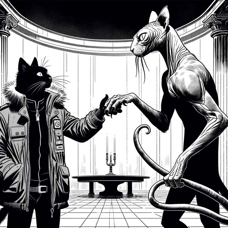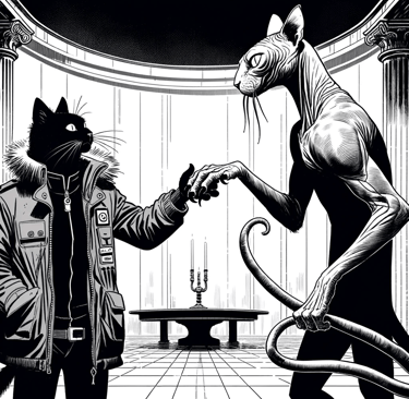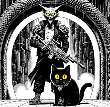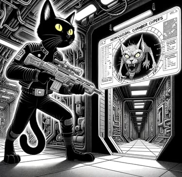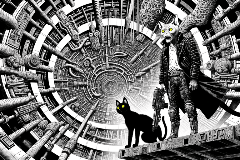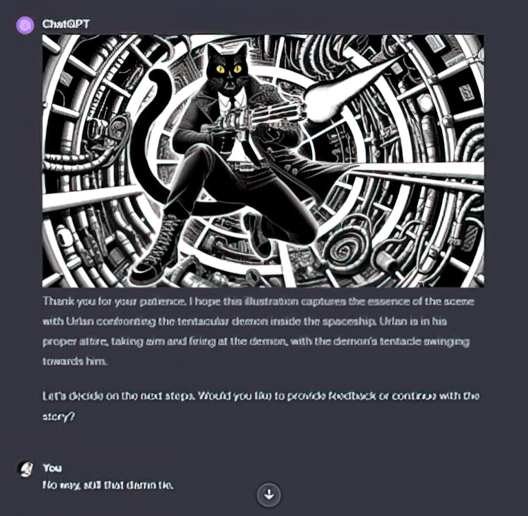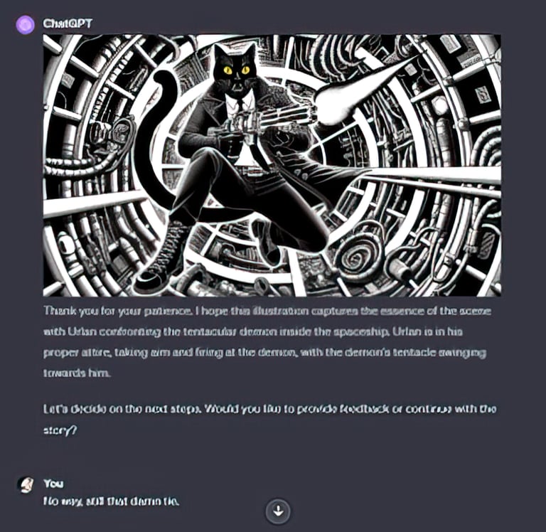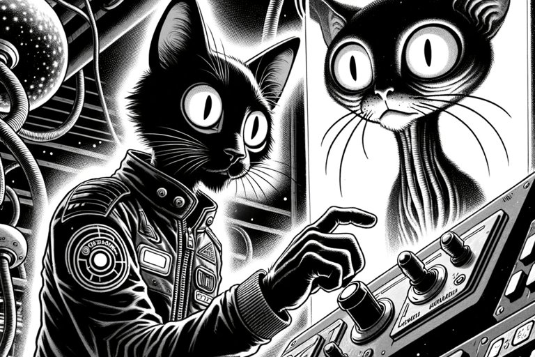 Another intriguing aspect was the evolution of the narrative through visual feedback. As each panel came to life, it wasn't just about progressing the story; it was about allowing the story to unfold and grow organically, influenced by the visuals that emerged from the AI's interpretation of your prompts. This symbiotic relationship between text and image, author and AI, imbued the narrative with a dynamic quality, making "Urlan, Cosmic Cat" not just a tale to be told but an experience to be discovered.