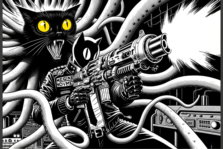 Absolutely, the creative journey with "Urlan, Cosmic Cat" certainly was an odyssey of adaptation and evolution. One of the most intriguing aspects of working with AI is that it operates without the inherent consistency a human artist might bring to the table. This resulted in each iteration of Urlan, his gear, and T.D. having variations, sometimes whimsical and other times frustrating.